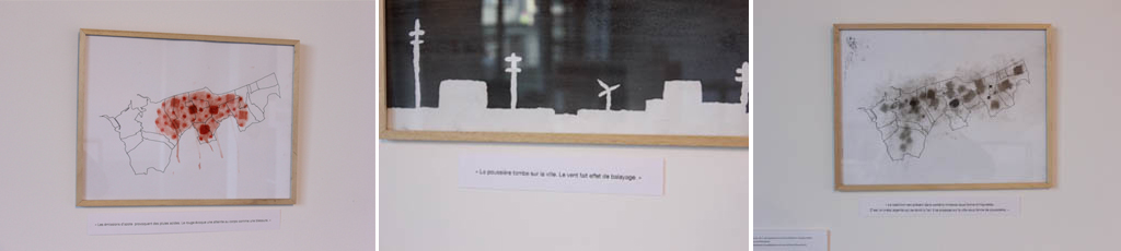 À partir des outils réalisés par l’organisme ATMO-Nord Pas de Calais, nous avons cherché à représenter la dispersion des émissions vue du ciel. Les gestes, les traces avec les pigments (graphite, vermillon, oxyde vert) nous ont aidé à les évoquer. Les vues au ras du sol laissent une grande part à la présence du ciel. La ville mise en réserve par le drawing-gum, est ce qu’il reste à protéger. Ce projet nous a permis de nous rendre compte de la pollution qu’il y a sur le territoire dunkerquois et spécifiquement à Grande-Synthe. Cela nous a surpris car nous ne nous attendions pas à ce que ce soit aussi pollué. Suite à ce constat, nous sommes démunis. Comment pouvons-nous préserver encore mieux ? »