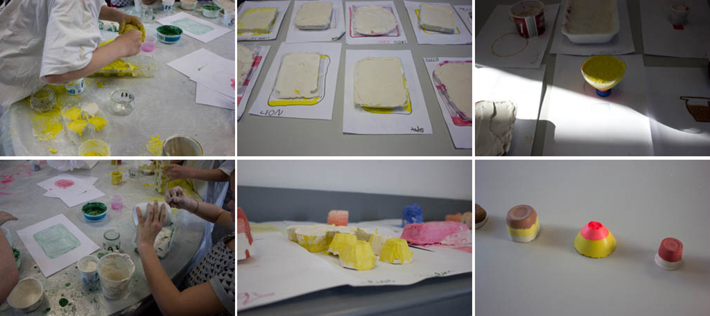 pour apprendre à réutiliser les déchets type emballage, connaître les couleurs, leurs origines et incite à expérimenter le mélange des couleurs, à composer graphiquement, à tenter un langage pictural, à voir en 2D puis en 3D et à exprimer ses idées par le moulage.