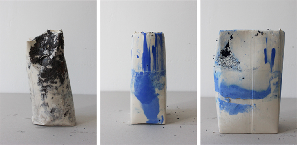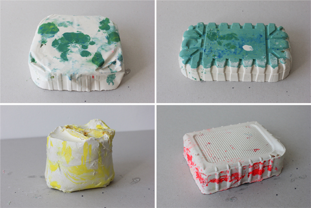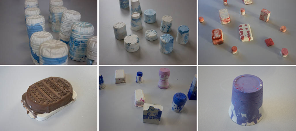 Ces différents moulages sont des empreintes d'emballages plastiques recyclés. La couleur signifie le contenu. Elle matérialise ce qu'il avait à l'intérieur du contenant. Grâce à cet atelier d'expérimentation plastique nous avons interrogé nos goûts, nos pratiques consommatrices, nos habitudes alimentaires. Le moulage du déchet le sublime. Il semble fossilisé. L'installation évoque l'archivage. Nous pourrions penser au travail d'archéologues. La forme de l'emballage est mise en valeur, c'est une forme issue d'une production industrielle, elle ressemble à celle des « legos ». Ces formes contrastent avec celles des aliments qui sont liquides, fluides, légers, mous, craquants. Cette installation dénonce une profusion du plastique.